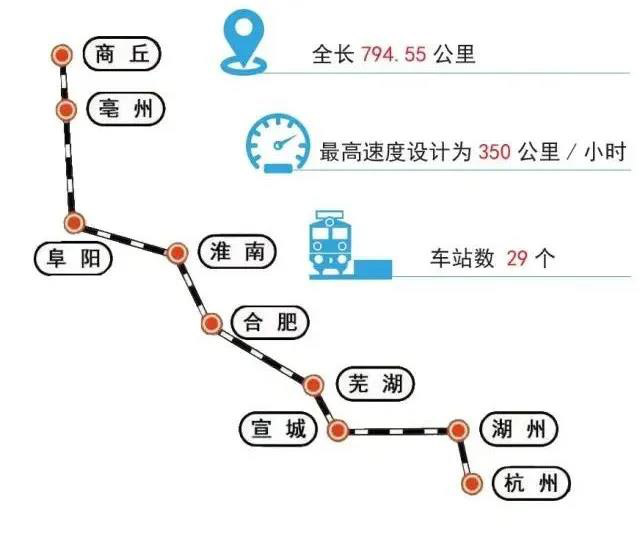 起点河南商丘,接郑徐高铁,经我省亳州、阜阳、淮南、合肥、马鞍山、芜湖、宣城7市24个县(区),至浙江湖州,接宁杭高铁,是西北、中原经合肥至华东、东南地区的快速客运大通道,也是安徽铁路网的钢铁脊梁。该铁路总投资992.47亿元。其中安徽段线路长630.9公里,新建线路约519公里。