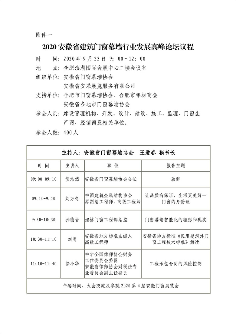 金秋时节,大湖名城。2020安徽省建筑门窗幕墙行业发展高峰论坛将于9月23日,在合肥国际滨湖会展中心二楼会议室举办,第4届安徽国际门窗展也同期召开。将为安徽门窗行业带来一场理念盛宴。