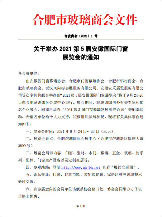 合肥市玻璃商会《关于举办2021安徽门窗展》的通知